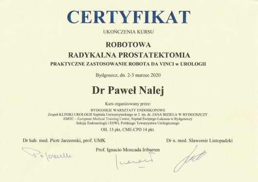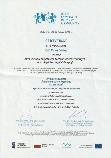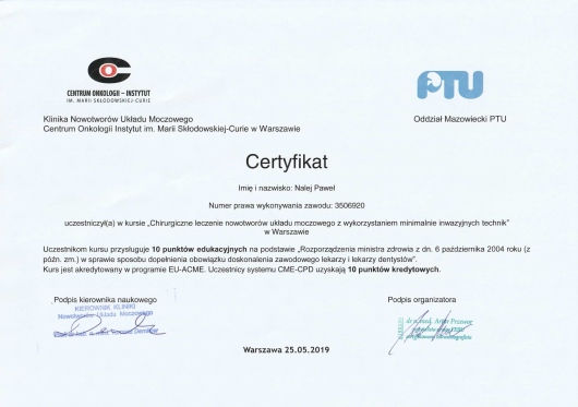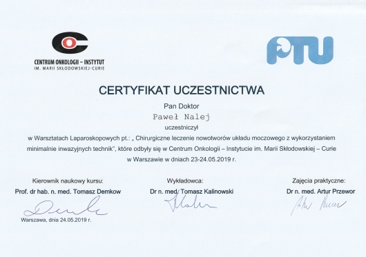 - Centrum Onkologii – Instytutu im. M. Curie-Skłodowskiej w Warszawie (Chirurgiczne leczenie nowotworów układu moczowego z wykorzystaniem minimalnie inwazyjnych technik – Warsztaty Laparoskopowe)