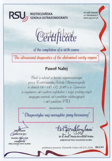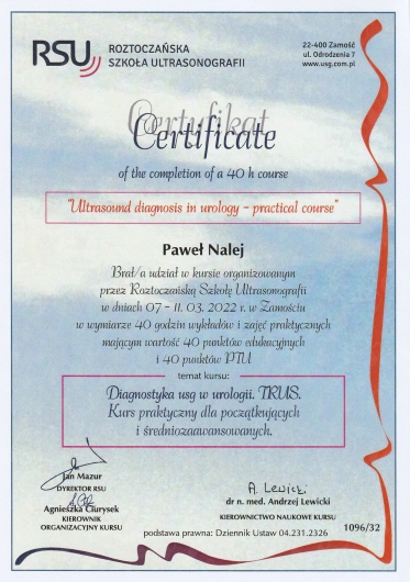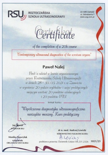 - Roztoczańskiej Szkoły Ultrasonografii (Diagnostyka USG narządów jamy brzusznej. Współczesna diagnostyka ultrasonograficzna narządów moszny. Diagnostyka USG w urologii. TRUS)